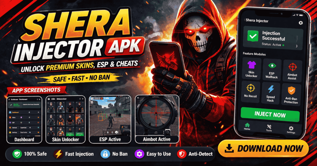 This is where Shera Injector Mod APK comes into play. It is a powerful Android tool that allows gamers to access premium skins and customization options without spending money. In this updated guide, we will explain everything about Shera Injector in a completely fresh way, including its features, installation process, advantages, disadvantages, and safety tips.